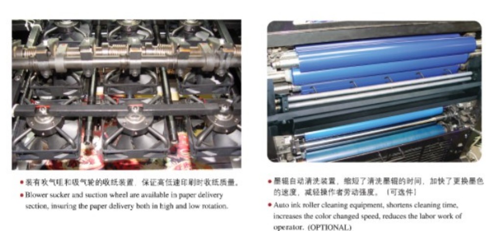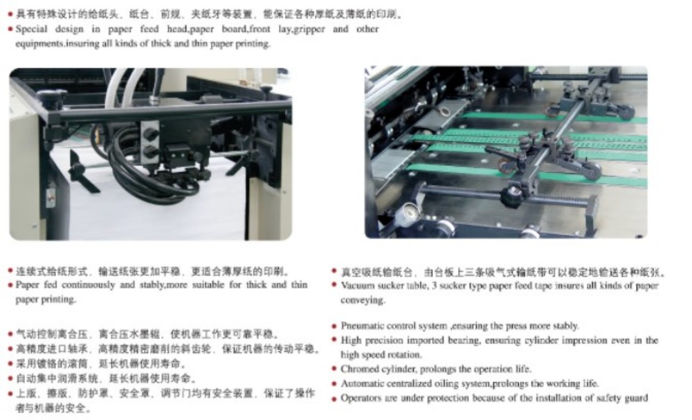 La grande macchina da stampa offset per etichette in quadricromia A3 è progettata con moduli ad alte prestazioni e sono tutti di altissima qualità: rulli e ingranaggi ad alta precisione, un potente meccanismo di alimentazione della carta, un sistema di registrazione della carta ad alta precisione e un sistema di alimentazione dell'inchiostro stabile. È progettato su misura per soddisfare le esigenze del mercato in termini di stampa a colori a fogli singoli di alta qualità, efficiente e conveniente. Non devi nemmeno limitarti a un solo spessore di carta: funziona con carta sottile (0,04 mm) fino al cartone spesso (0,4 mm). È inoltre disponibile un controllo touchscreen con un'interfaccia di programmazione intuitiva, che consente di regolare le impostazioni e i parametri di stampa in modo semplice e intelligente.